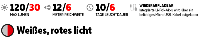 - 120 Lumen weißes Licht und 30 Lumen rotes Licht mit einem weiten Beleuchtungswinkel von 110°.